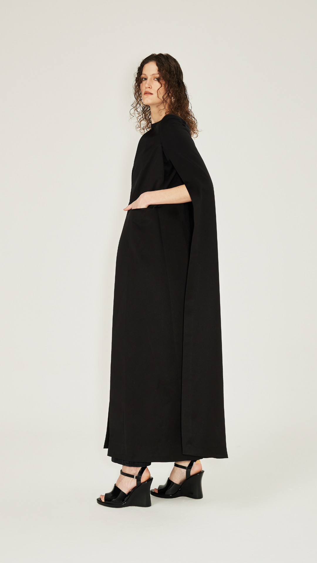 Our Cape Abaya is a stylish and trendy piece with a structured blazer-style bodice with a flowing sleeveless cape attached at the arms and shoulders. The Abaya is made from Italian satin and you can dress up with a cocktail dress or any other outfit.