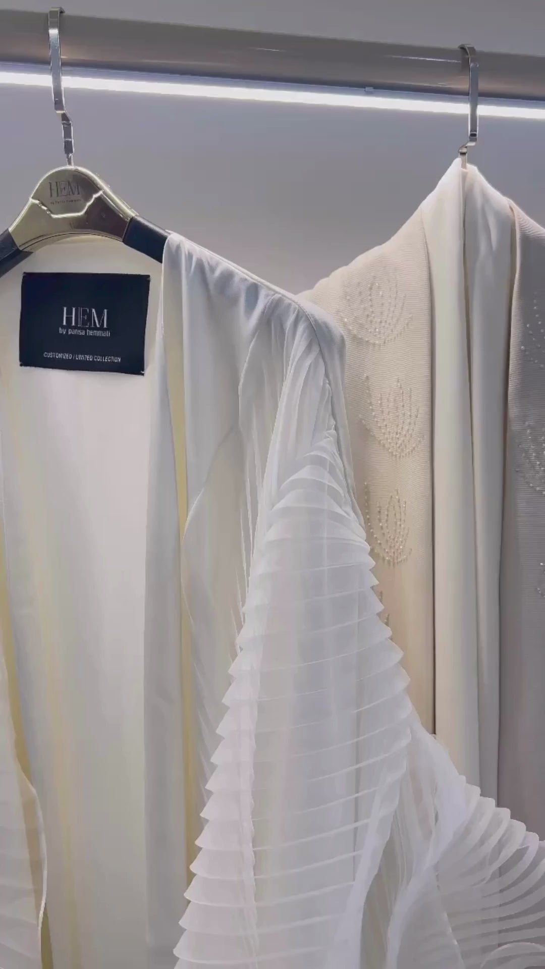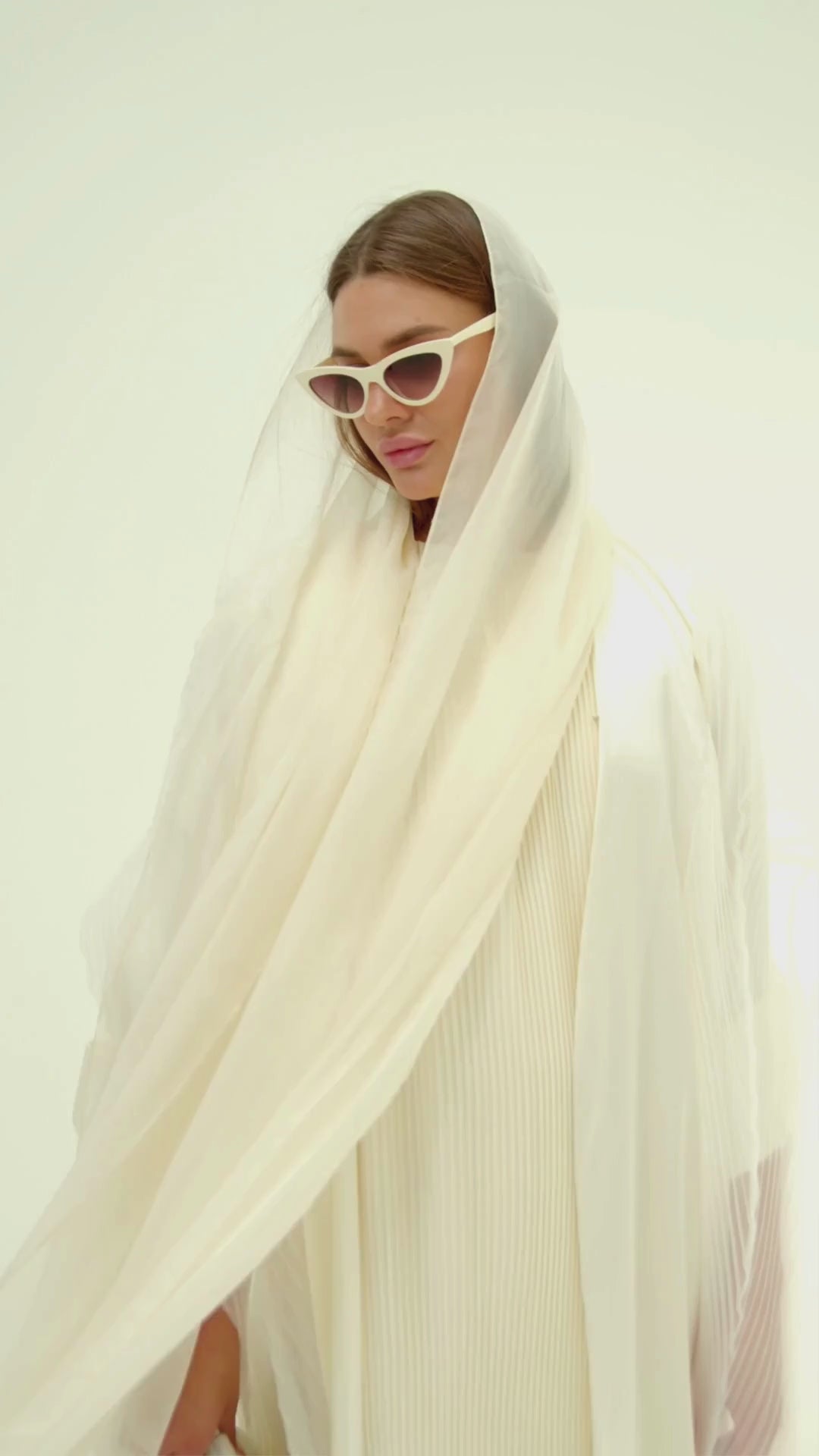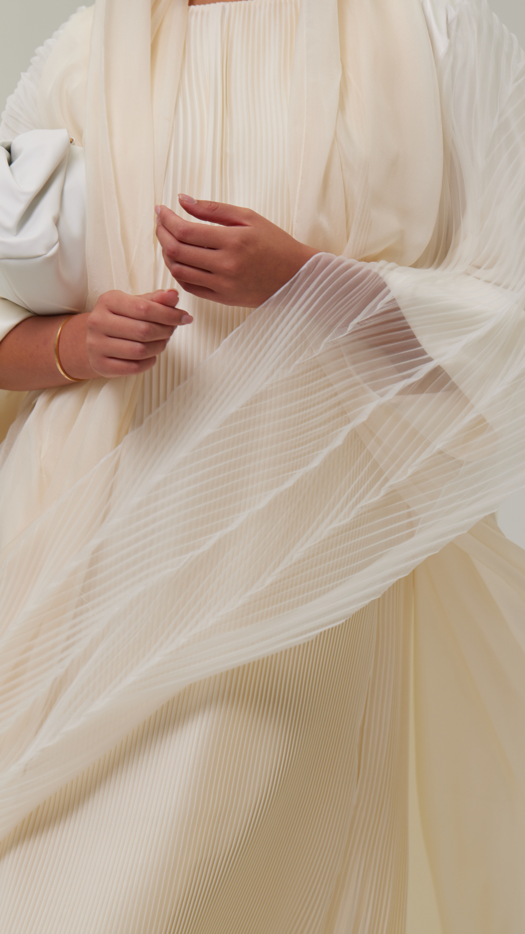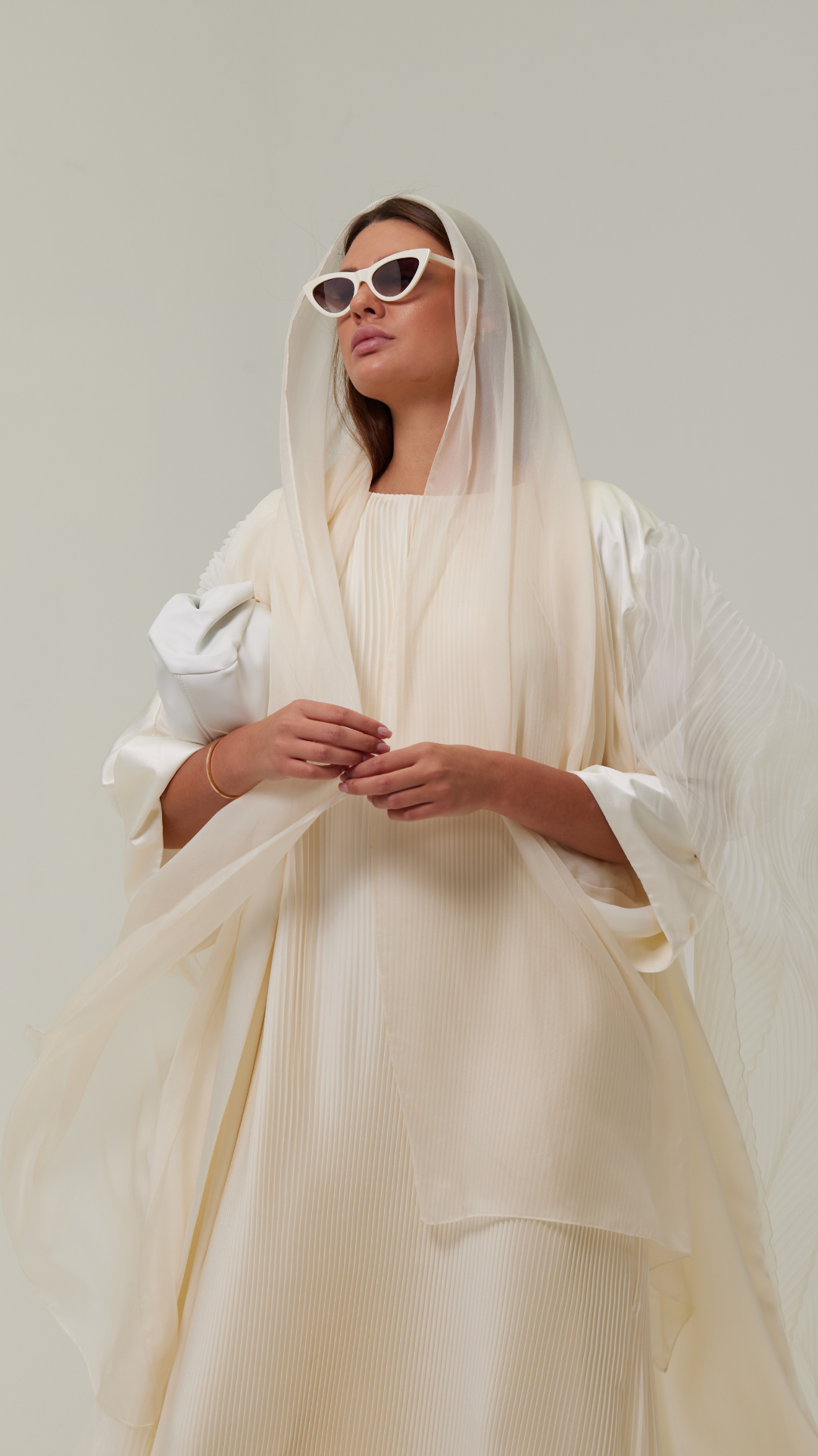 Our eve Abaya is characterized by its pleated design. Pleated part gives volume and movement to your look. Abaya is made of 100% silk in jet black color, it has a folding sleeves shape. We recommend you to order this Abaya with our special inner set in pleated black fabric.