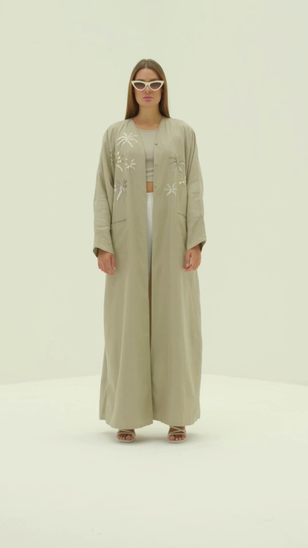 Elevate your style with the Palms on Linen Beige Abaya. Made from high-quality Belgium linen in a versatile beige hue, this Abaya features intricate Golden and silver palm embroidery on the front. Pair it with white trousers or a casual outfit for a chic look.