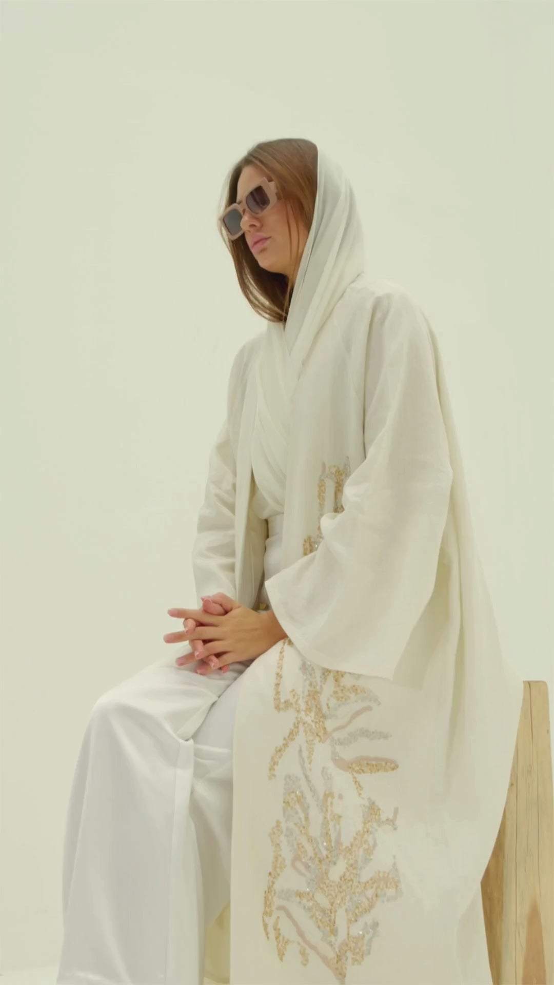 Experience elegance with this flowing, off-white Linen featuring wide sleeves and intricate golden embroidery inspired by marine flora. The minimalist design is both sophisticated and versatile, perfect for various occasions, this piece captures underwater beauty in a wearable form.