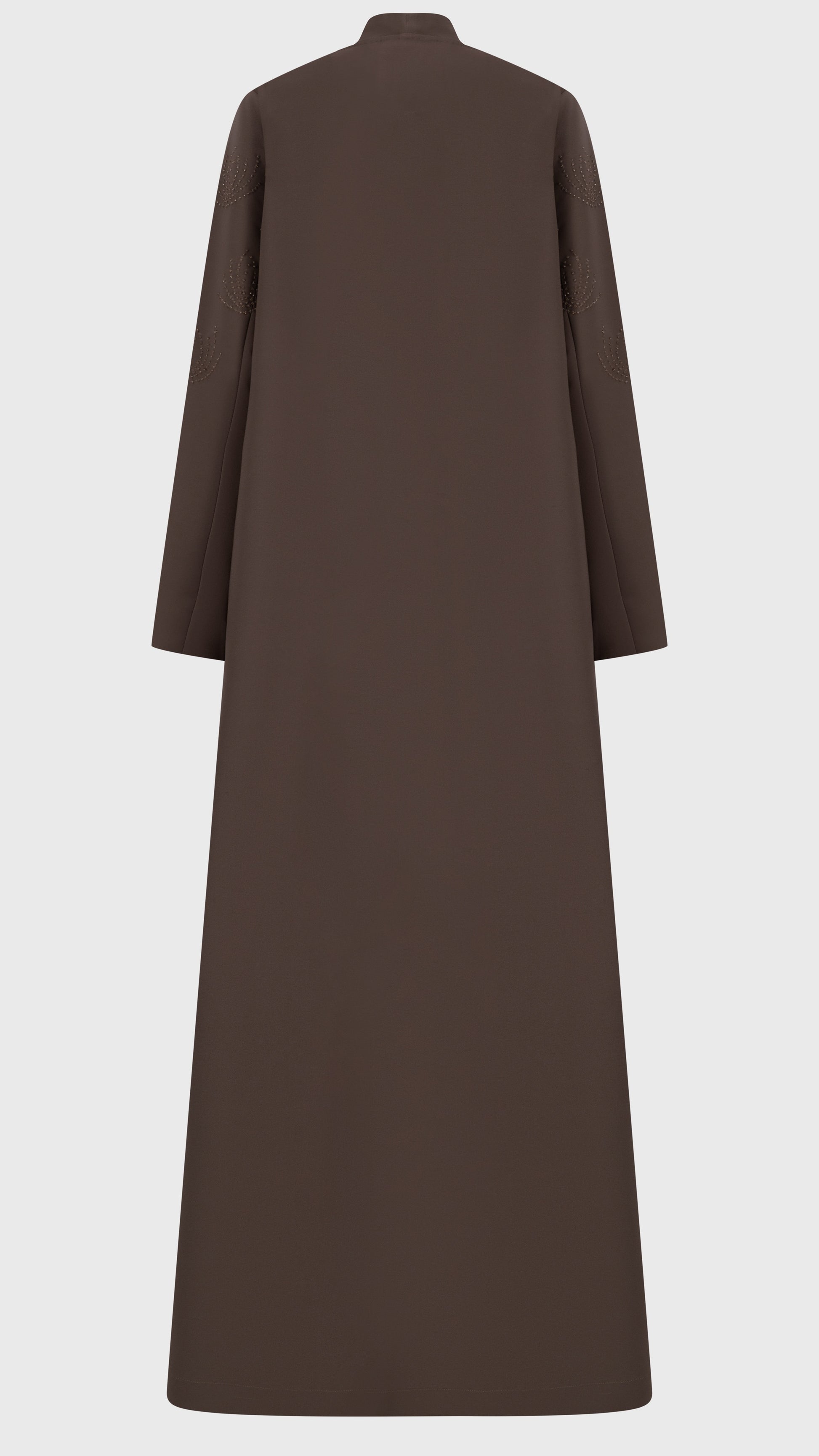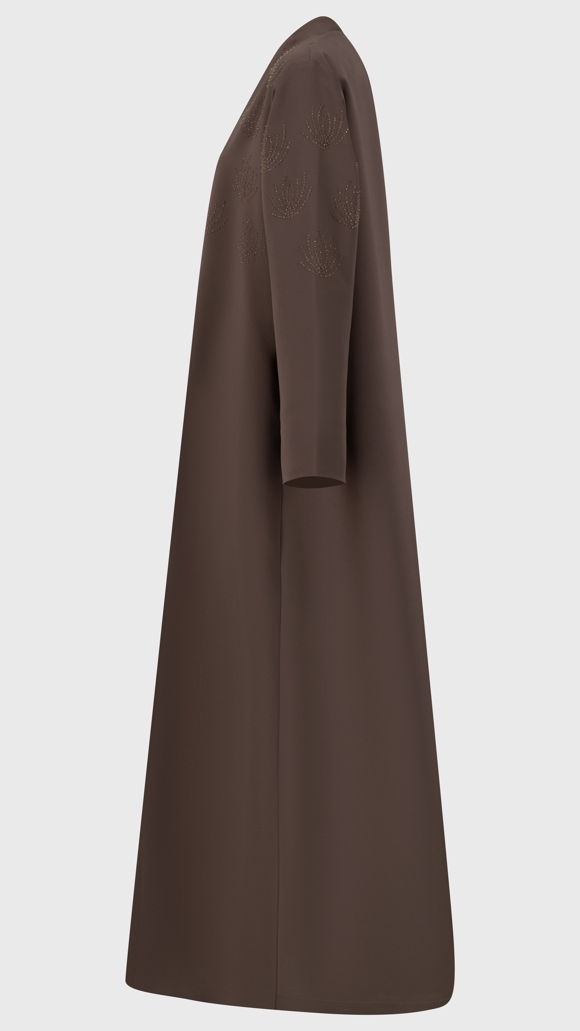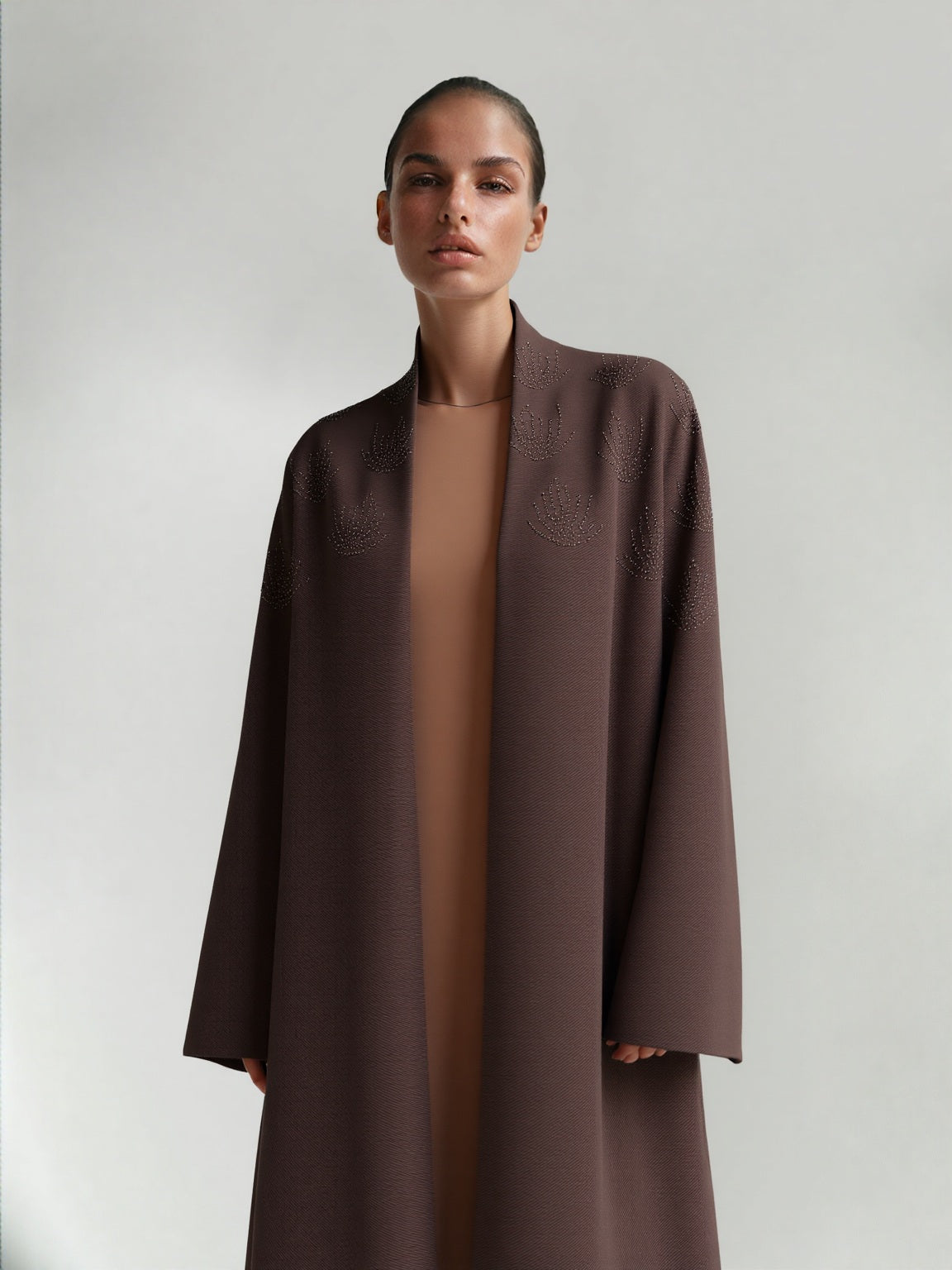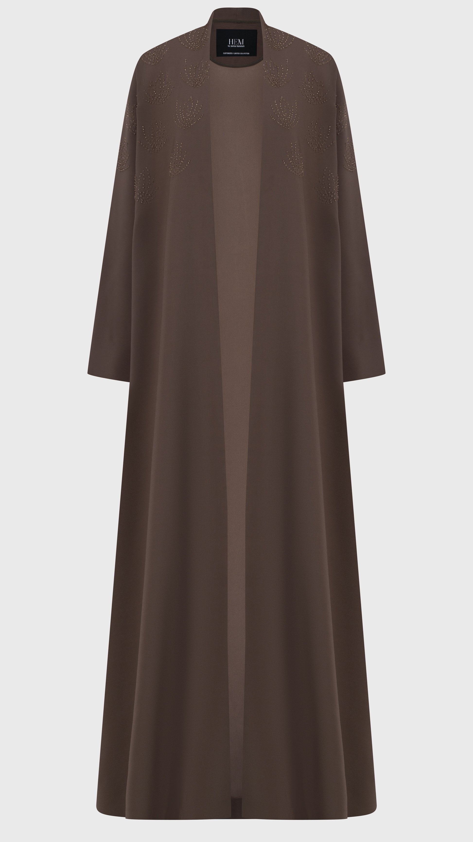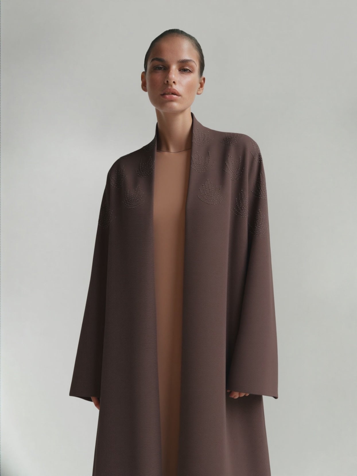 Refined luxury in every detail—the Italian Crepe Flower in Taupe by HEM Fashion is crafted from premium Italian crepe, with delicate hand embellishments accenting its sleek, fitted jacket silhouette. Best styled with a matching Taupe Sheila, it’s a timeless statement of sophistication.