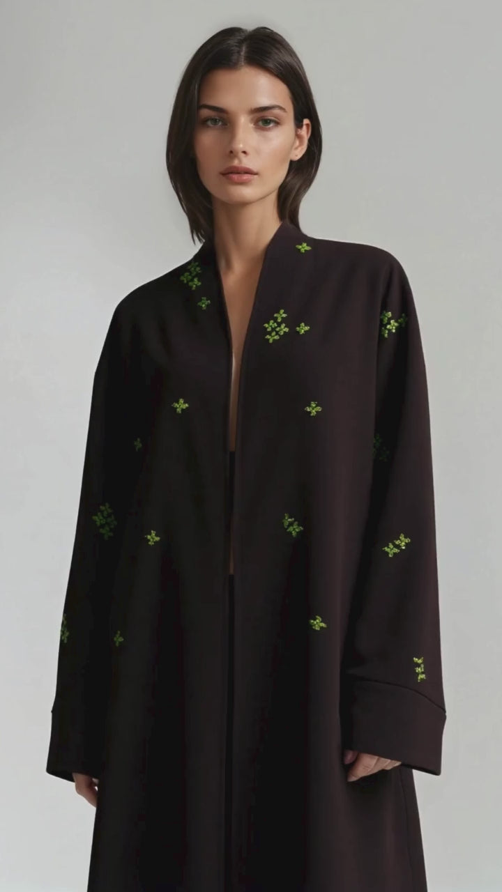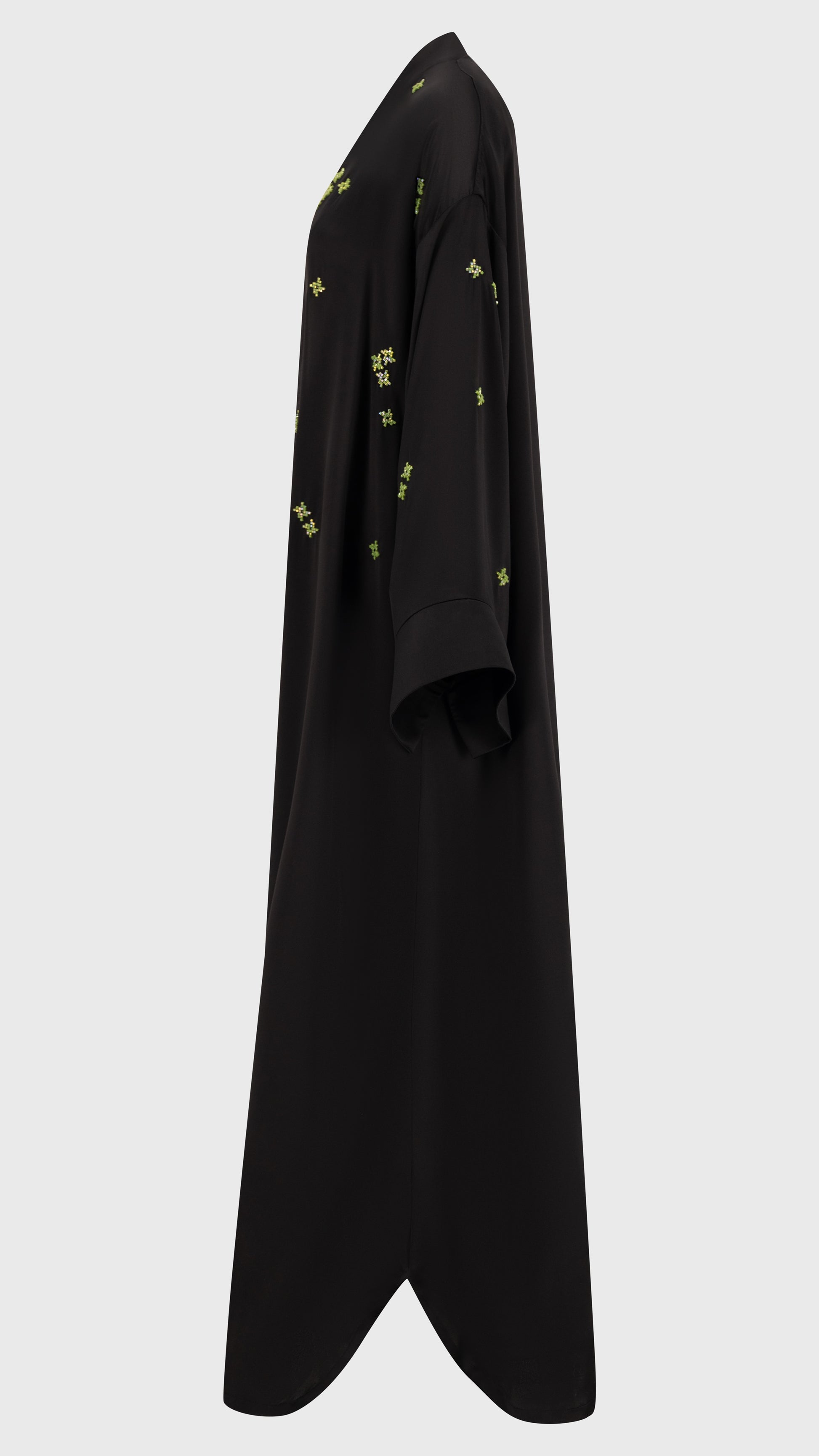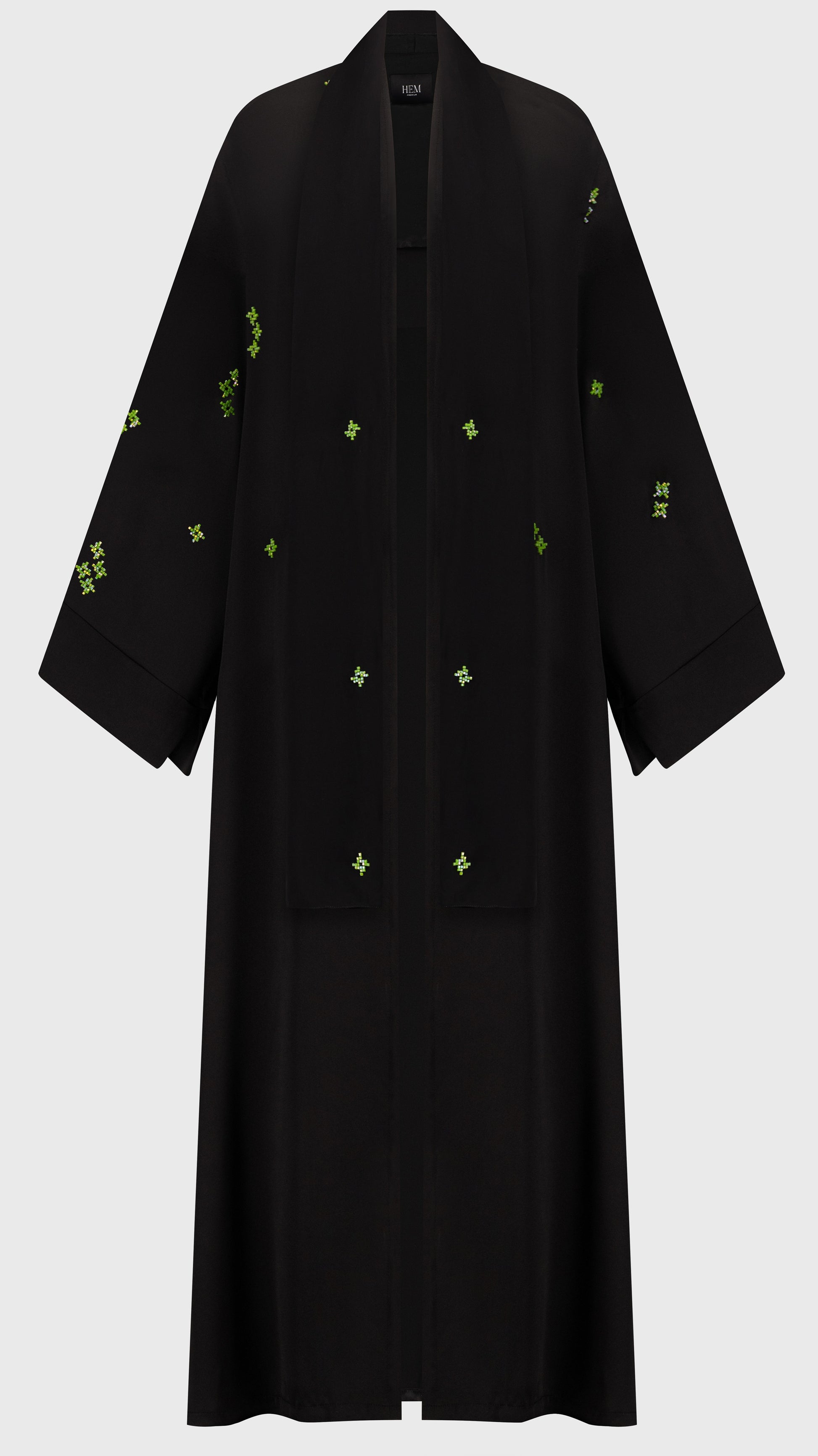 LIME BLACK by HEM Fashion—an effortless fusion of elegance and comfort. Crafted from exquisite Japanese satin, its flowing silhouette features delicate hand embellishments for a subtle shimmer. Designed in a relaxed fit, it pairs perfectly with the matching sheila for a refined monochrome statement. Quiet power, undeniable grace.