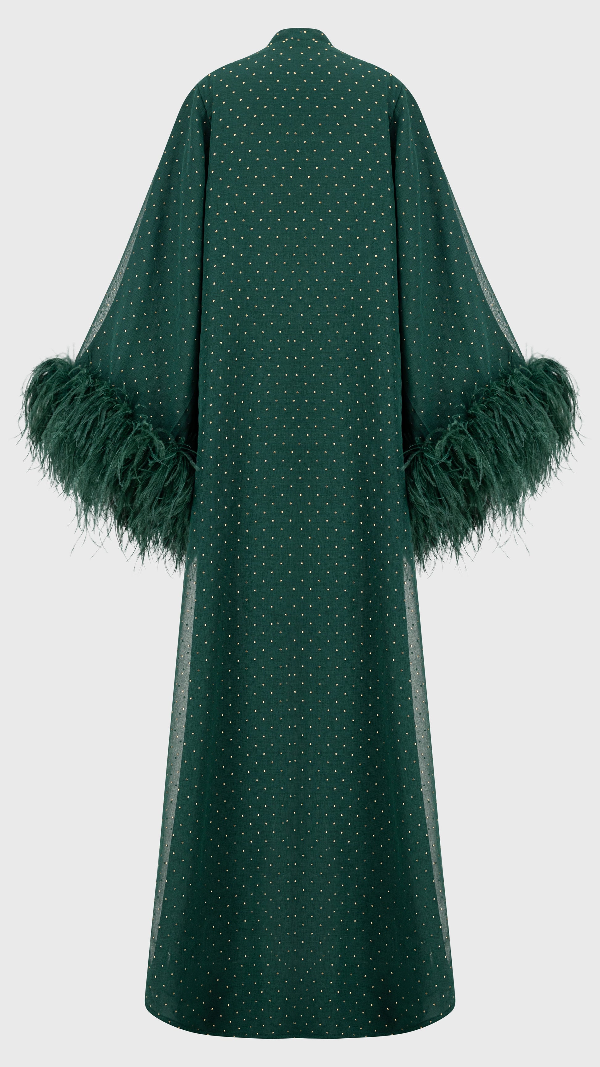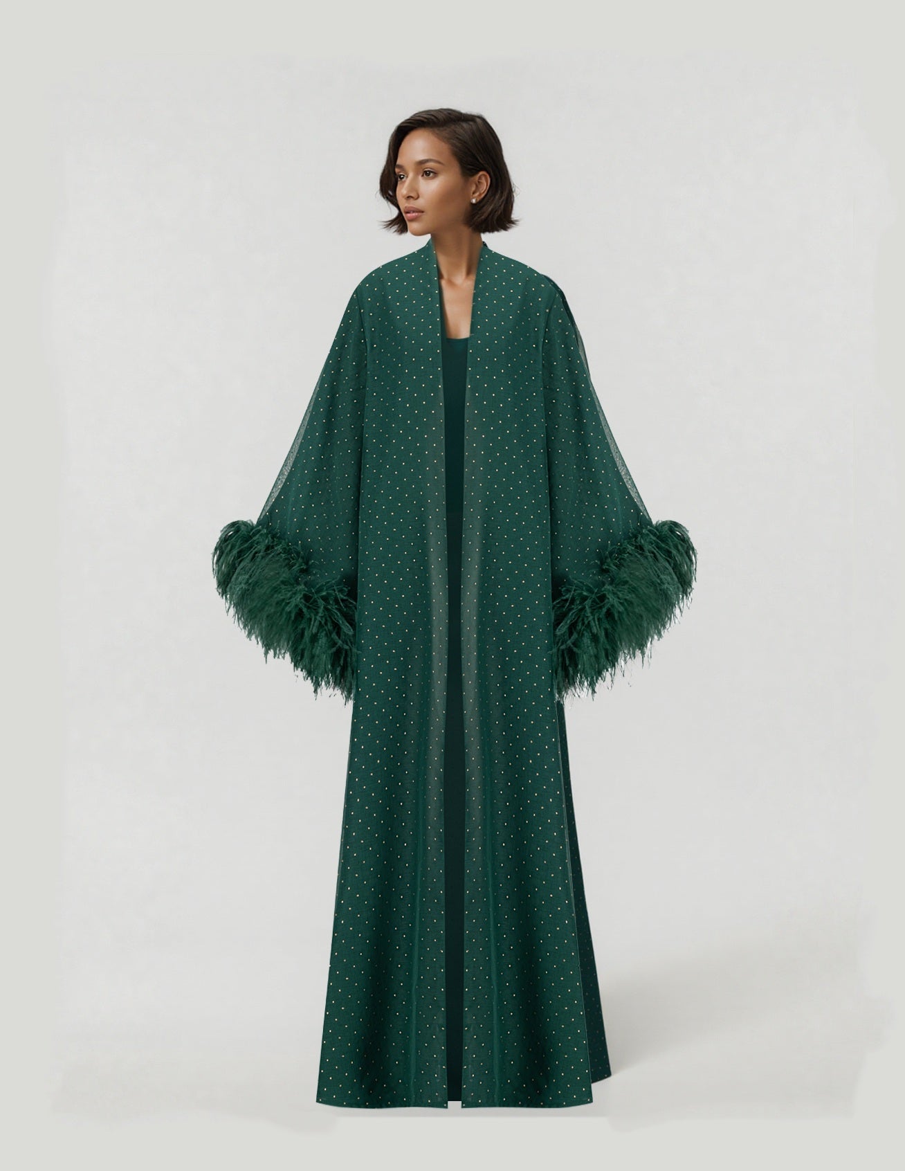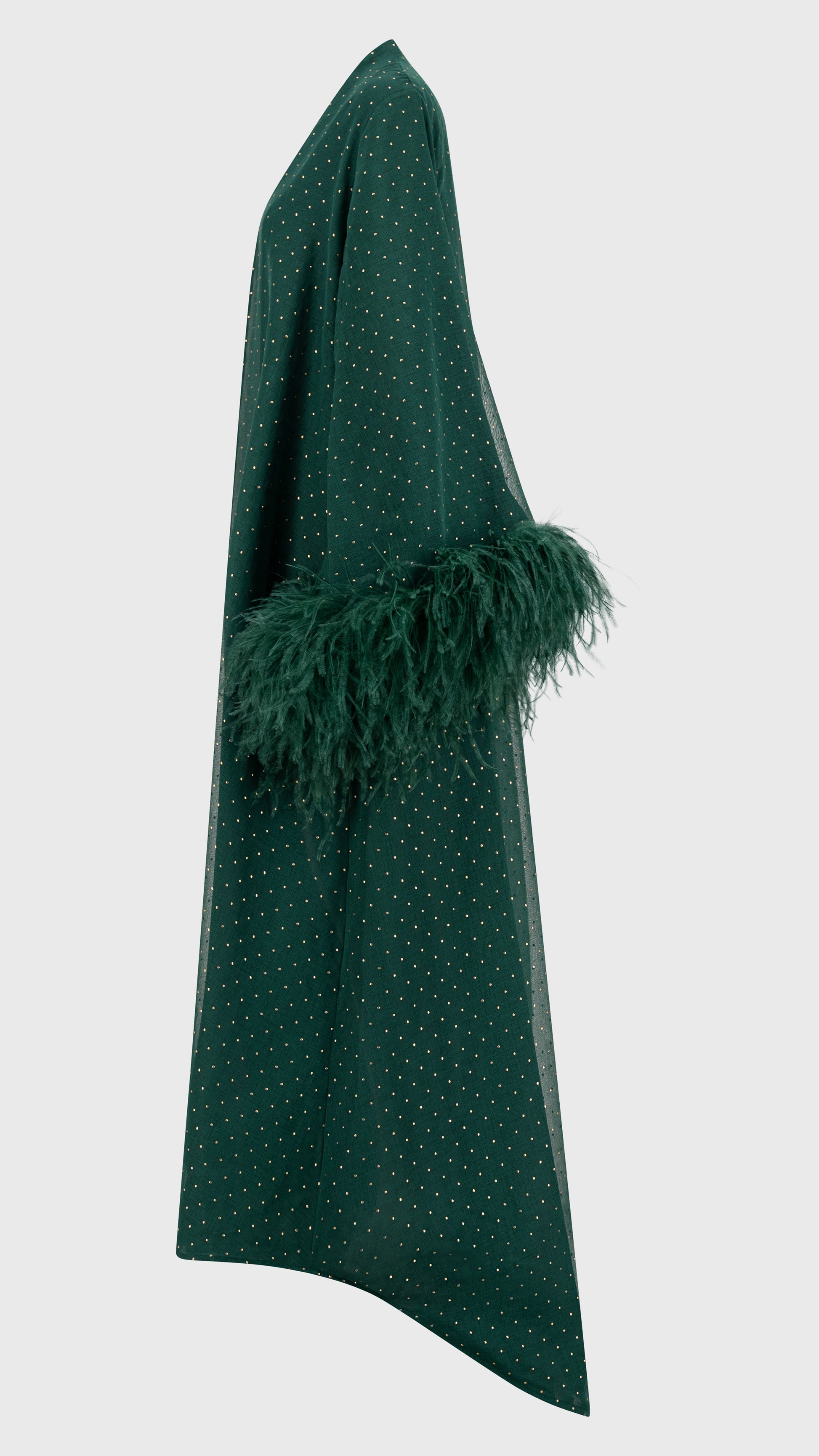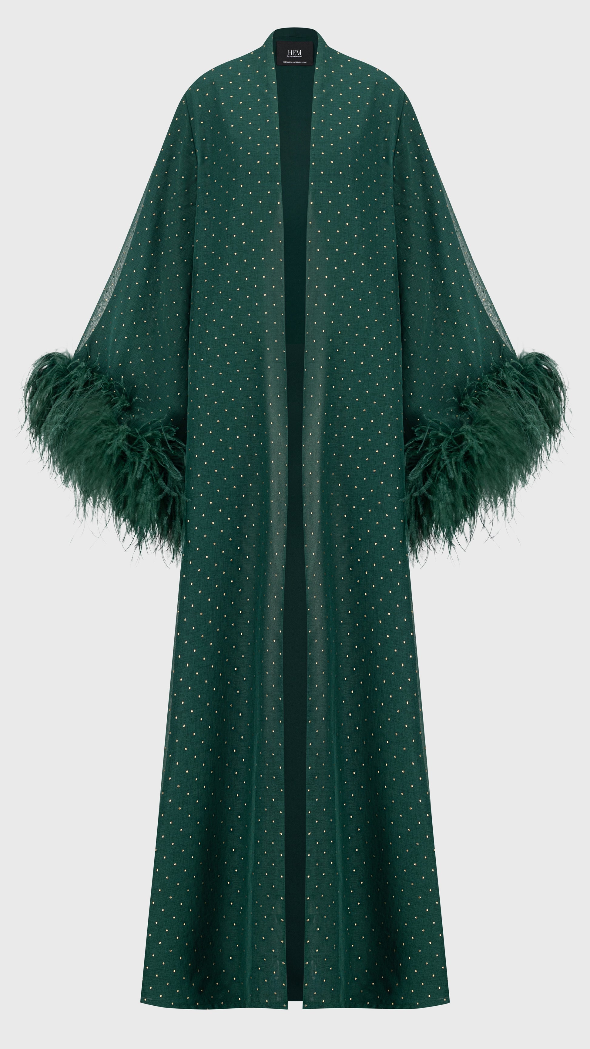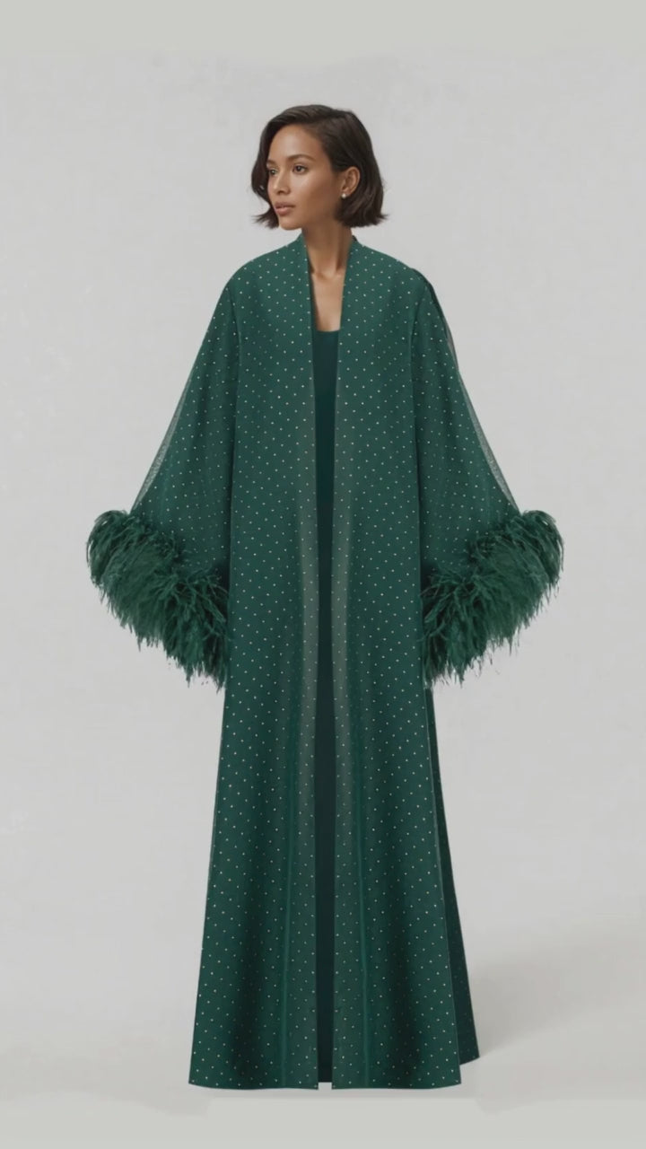 Elevate your elegance with the POLKA DOT EMERALD, a masterpiece of sophistication. Flowing Turkish chiffon linen in emerald green shimmers with light golden polka dots, exuding refined charm. A stitched chiffon lining ensures graceful movement, while Italian feather detailing adds a touch of opulence. With its abaya cut and normal fit, it drapes effortlessly, complemented by a matching emerald sheila. Poised, luxurious, and timeless—an ode to modern grace.