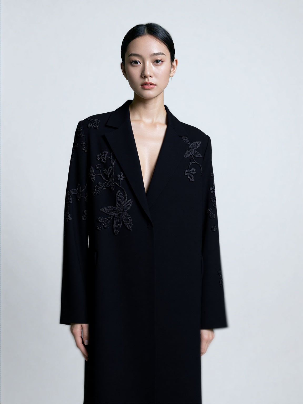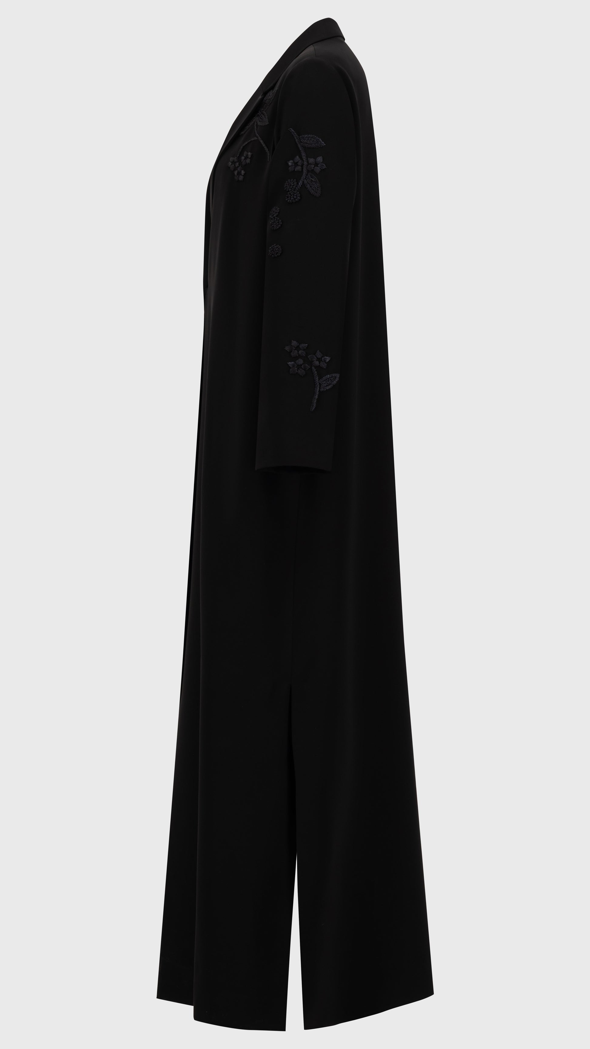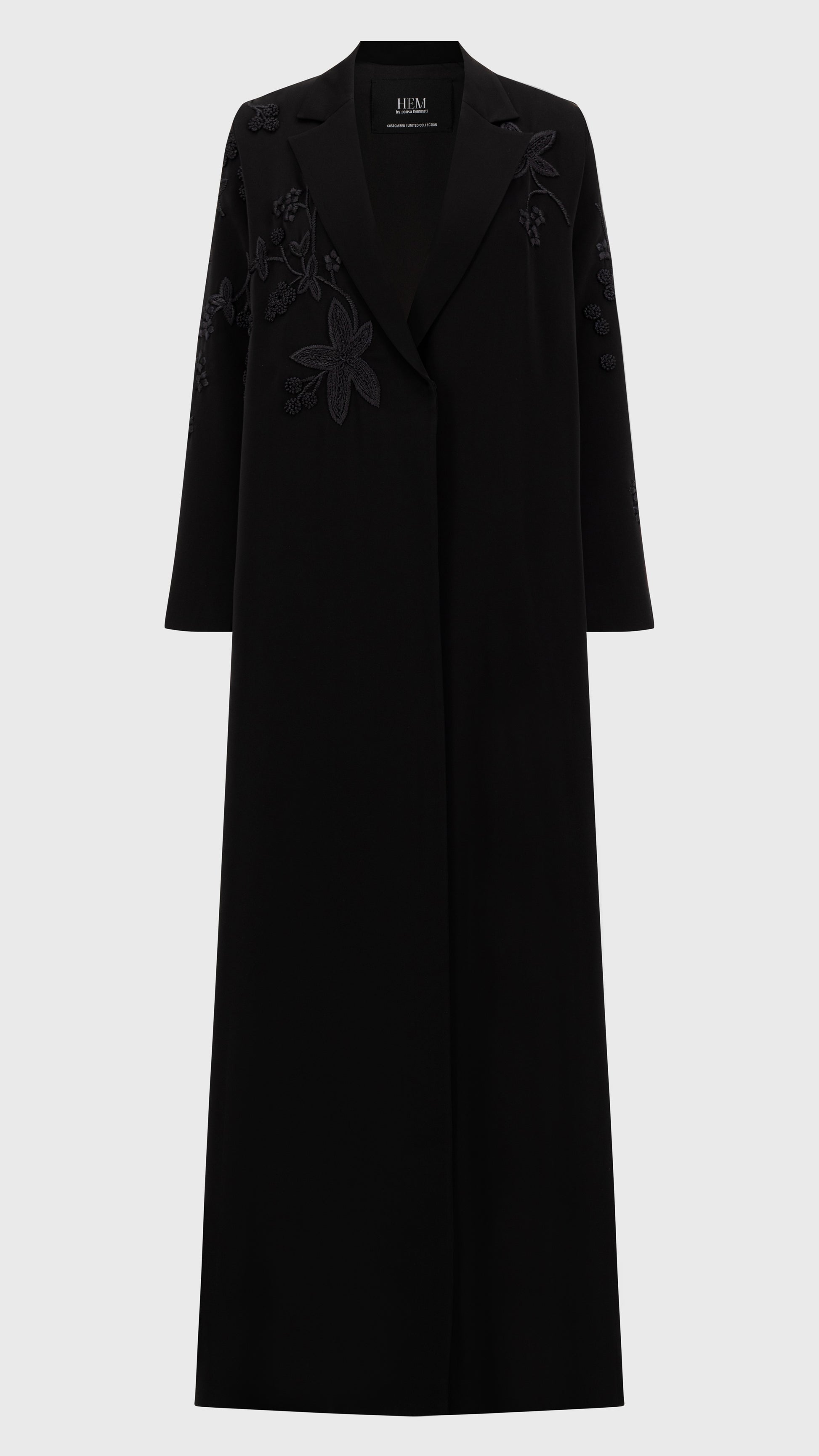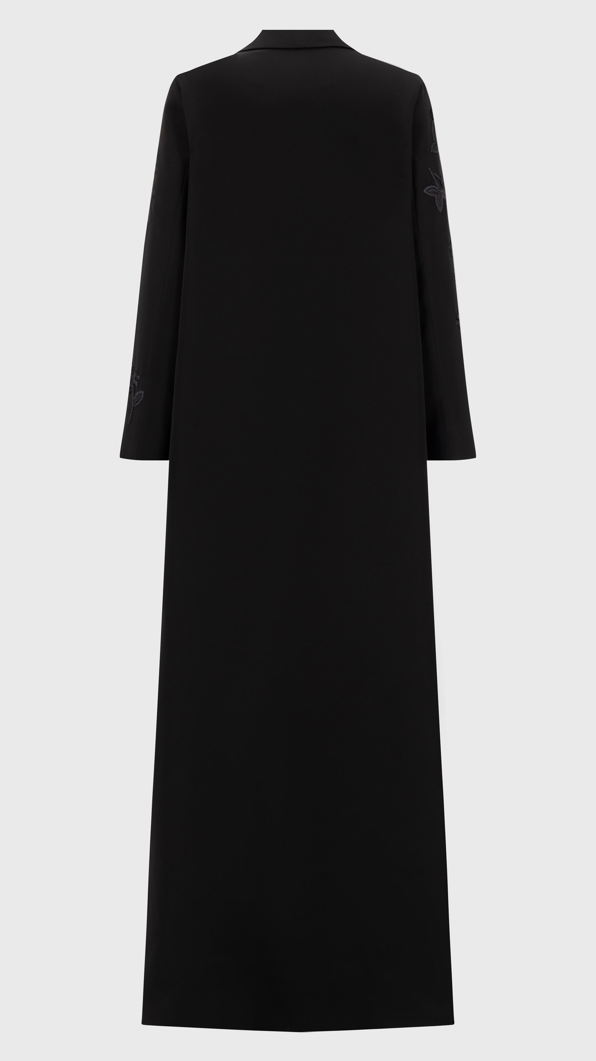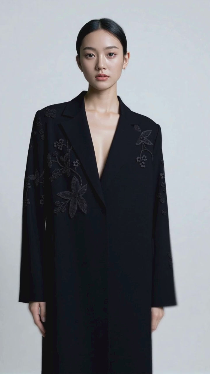 THREADÉ in Black redefines understated luxury with its sleek, fitted silhouette. Crafted from premium Japanese crepe, it drapes effortlessly, while hand-embellished threadwork adds a touch of quiet artistry. Designed for a refined monochrome look, it pairs seamlessly with a matching black Sheila—an emblem of sophistication in every detail.